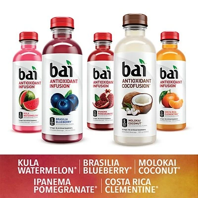 Brasilia Blueberry, Costa Rica Clementine, Molokai Coconut, Kula Watermelon, and Panema Pomegranate Bai Drink flavors