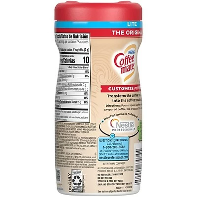 Enjoy creamy coffee with less guilt with this Lite powdered creamer. It contains 50 percent less fat than the original variety for fewer calories, and it’s lactose-free, gluten-free and certified kosher to meet restricted dietary requirements. This 11-ounce canister of Coffee-mate powdered creamer has a flip-top lid for easy, controlled pouring.