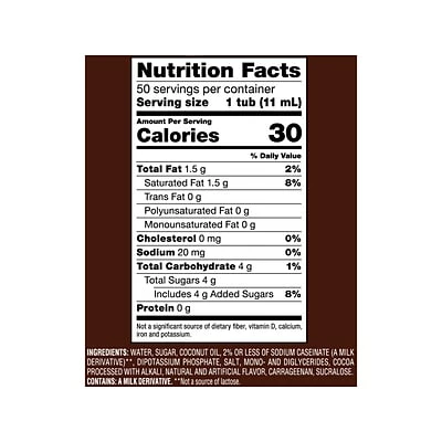 Ingredients: water, sugar, coconut oil, 2% or less of sodium caseinate, dipotassium phosphate, salt, monoglycerides and diglycerides, cocoa processed with alkali, natural and artificial flavor, carrageenan, and sucralose
