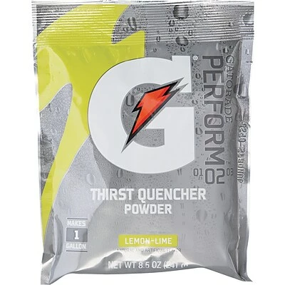Gatorade® Lemon-lime dry mix energy drink in 8.5 oz pack has carbohydrates and electrolytes that stimulate rapid fluid absorption. Instant powder energy drink is easy to make and offers energy to working muscles for improved performance.
