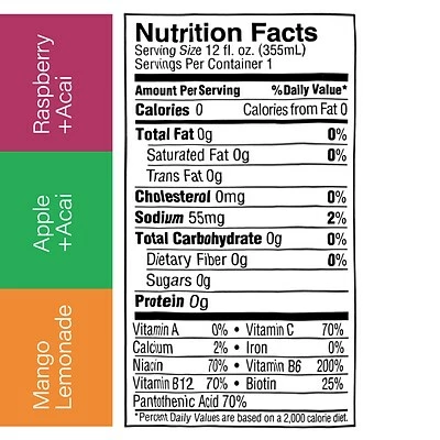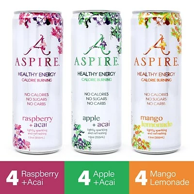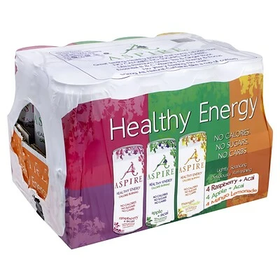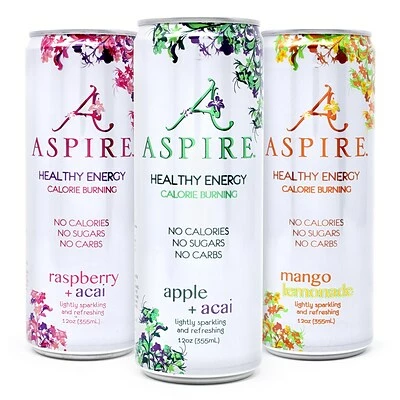 A 12-count pack of Aspire’s 12 oz. energy drinks. This pack comes with four cans each of Raspberry Acai, Mango Lemonade, and Apple Acai flavors. With no calories, sugars, or carbs, and packed with essential B and C vitamins and nutrients, this is an energy drink you can feel good about. The natural ingredients in Aspire can help fuel metabolism, helping you burn more calories without the jittery crash of traditional energy drinks. Substitute your morning coffee, afternoon pick-me-up, or traditional energy drink with Aspire.
