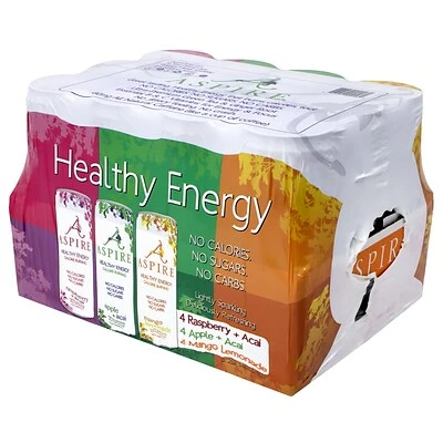 Aspire energy drink assortment includes four cans each of Raspberry Acai, Mango Lemonade, and Apple Acai flavors