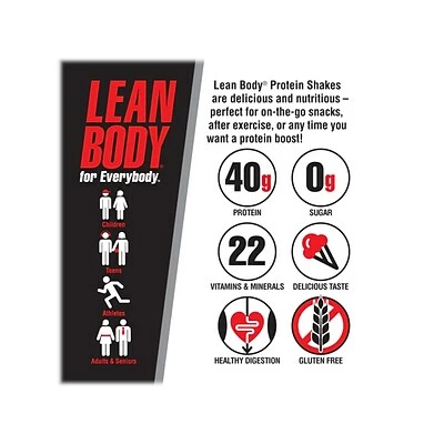 To many people, a “lean body” means better health, more energy, strength, and an improved sense of well-being. Whatever goal drives you, the Lean Body Ready-to-Drink protein shake can help you reach it. The drink provides high-quality protein without sugar or gluten. The protein provides nutritional support for lean muscle in a convenient shake with a delicious, creamy taste that hits the spot every time. The Lean Body protein drink can help you manage your weight by helping curb appetite and food craving, thus helping you feel more full and satisfied. And when you feel satisfied, you’re less likely to over-indulge in unhealthy snacks.