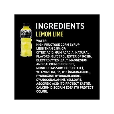 Ingredients: water, high-fructose corn syrup; less than 0.5% of: citric acid, gum acacia, natural flavors, glycerol ester of rosin, electrolytes (salt, magnesium, and calcium chlorides, monopotassium phosphate), vitamins B3, B6, B12 (niacinamide, pyridoxine hydrochloride, cyanocobalamin), Yellow 5, ascorbic acid (to protect taste), calcium disodium EDTA (to protect color)