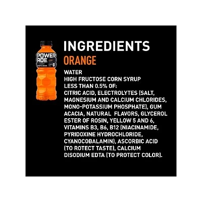 Ingredients: water, high-fructose corn syrup; less than 0.5% of: citric acid, gum acacia, natural flavors, glycerol ester of rosin, electrolytes (salt, magnesium, and calcium chlorides, monopotassium phosphate), vitamins B3, B6, B12 (niacinamide, pyridoxine hydrochloride, cyanocobalamin), Yellow 5 and 6, ascorbic acid (to protect taste), calcium disodium EDTA (to protect color)
