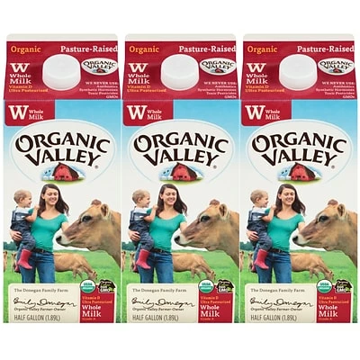 A 3 pack of Organic Valley Ultra Pasteurized Whole Milk in 64oz cartons