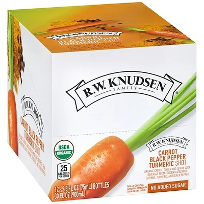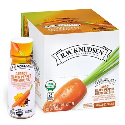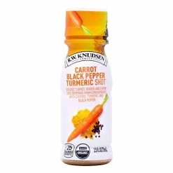 A 12 count pack of RWK Carrot Black Pepper Turmeric Shot’s in 2.5 fl oz bottles. Each shot is made with a blend of organic carrot, ginger and lemon juice from concentrates with cayenne, turmeric and black pepper. They’re made with no added sugars, 0 grams of fat, low calorie and USDA certified Organic. There is no refrigeration needed to make transportation easy and convenient, so you can take a shot whenever you need a boost in your day!