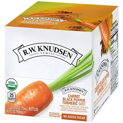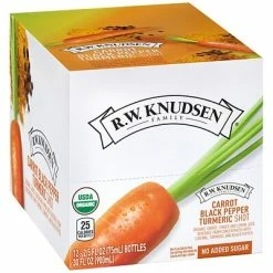 A 12 count pack of RWK Carrot Black Pepper Turmeric Shot’s in 2.5 fl oz. bottles