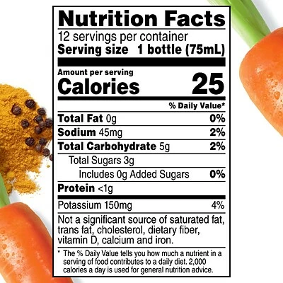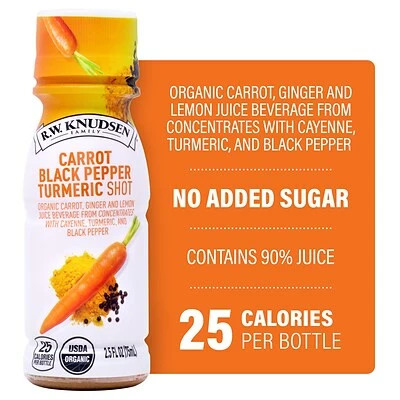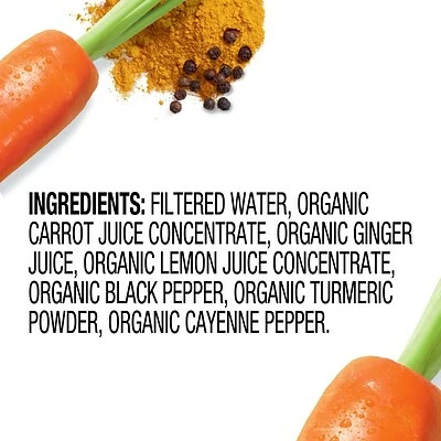 Made with simple ingredients: organic carrot, ginger and lemon juice from concentrates with cayenne, turmeric and black pepper