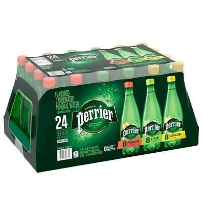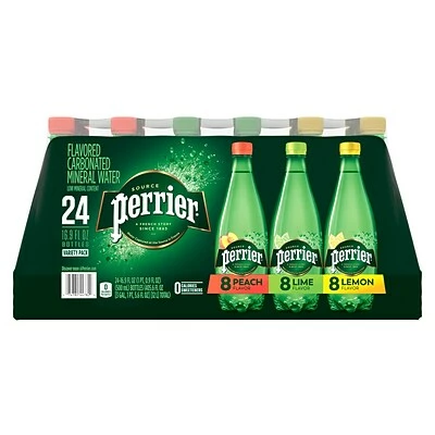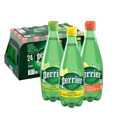 The PERRIER Carbonated Mineral Water Assorted Flavor Pack contains three crisp, thirst-quenching varieties: Peach, Lemon and Lime Flavor. Stylish. Bold. Daring. PERRIER inspires the imagination and stimulates the senses. A sparkling fusion of air and water, PERRIER has been bottled in the South of France since 1863. Our bubbles and unique mineral blend make for a great taste that thoroughly quenches thirst with zero calories or sweeteners. Itβs a wonderful choice to add zest to your morning or serve as an afternoon refresher. Unleash the force of PERRIER Carbonated Mineral Water and satisfy your thirst for the extraordinary.